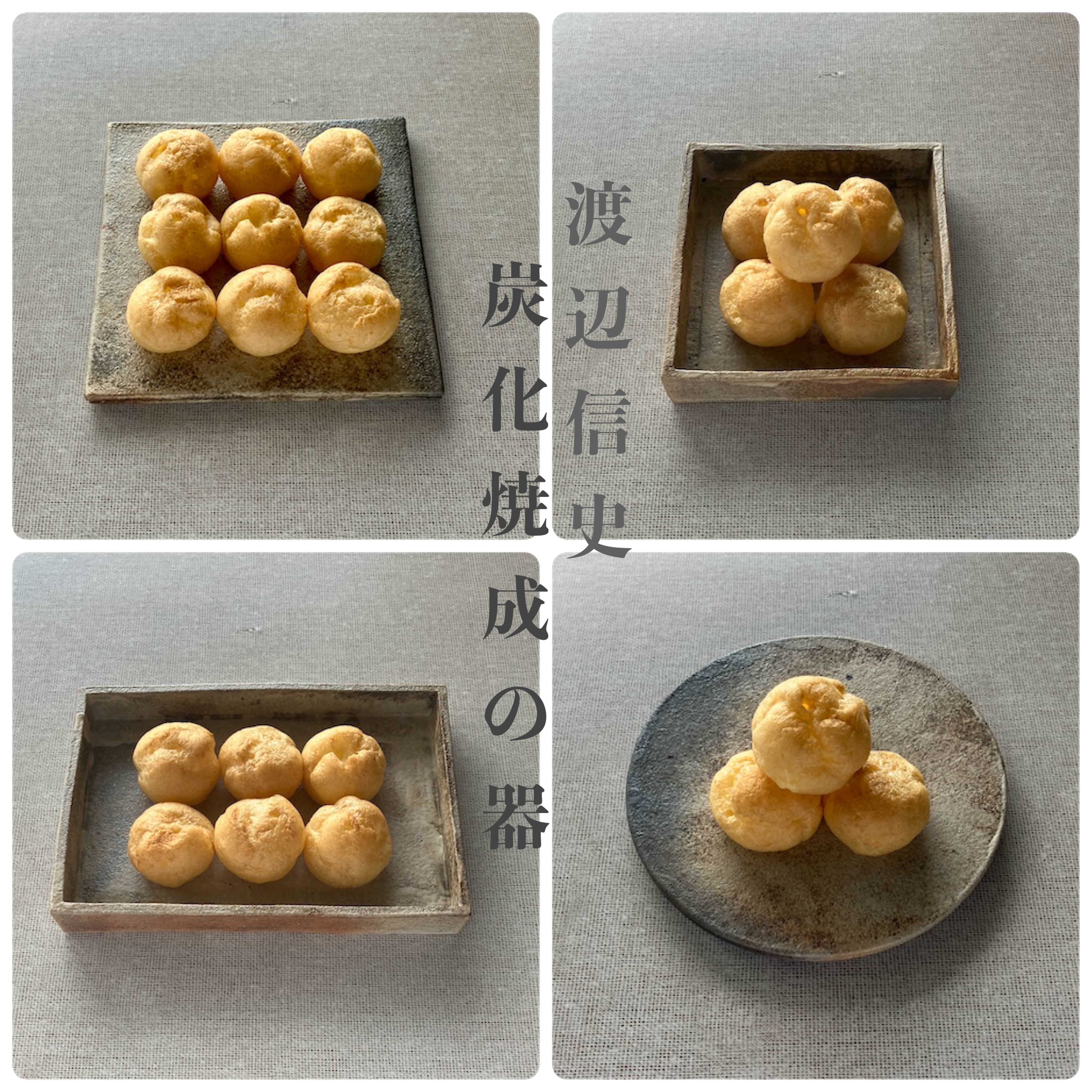 【つくり手のこだわりの作風が光る】 ・炭化焼成による独特な表情 《渡辺信史》炭化シリーズは、焼成時に炭や籾殻を用いる事で、器一つ一つに豊かな表情が現れます。盛り付けた食材の鮮やかさが映える器です。 ◉ 商品名《渡辺信史》炭化角菓子皿 [B201] ◉ サイズ おおよそ 直径15cm