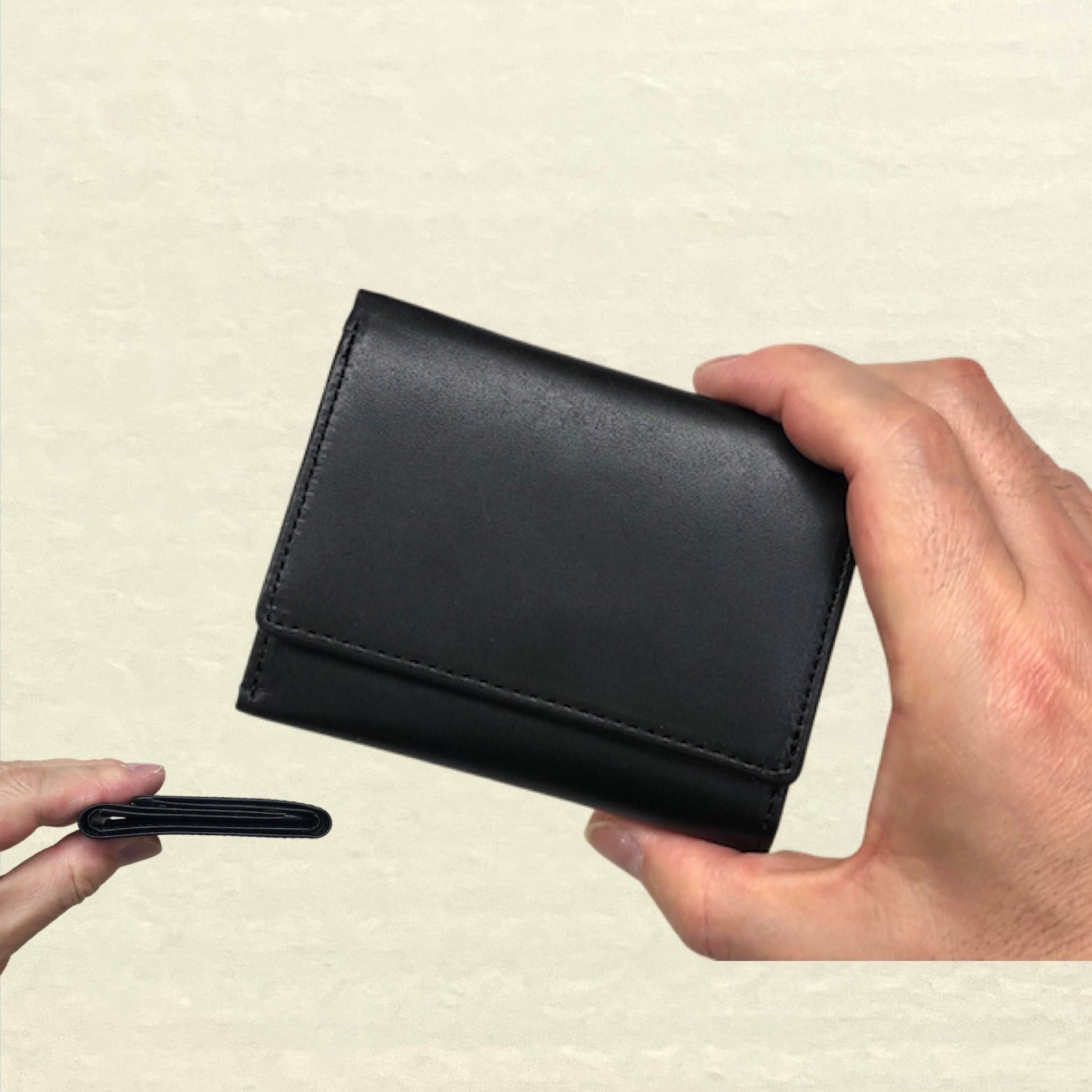 財布全体と各パーツごとで革の厚みを研究し設計されています。こちらはユーザーからの声で誕生した小さい財布の『小銭入れなし』タイプ。