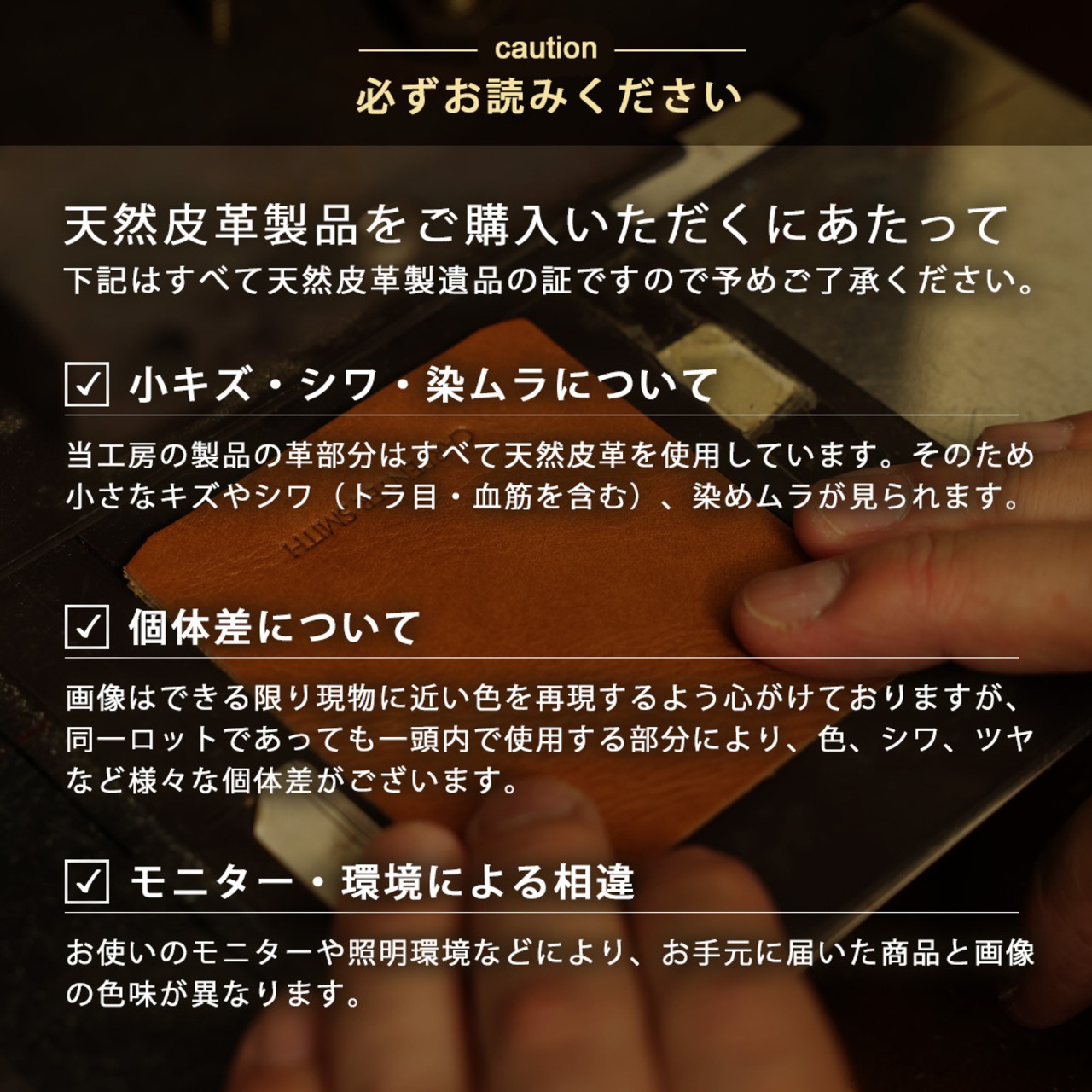 ・本製品の皮革部分には、すべて天然皮革を使用しております。そのため、表面に小さな傷やシミ、斑点、くぼみなどが見られることがあります。 また、ロットや革一枚の使用部位によっても、色味や質感が異なる場合がございますが、天然素材ならではの証と風合いとしてお楽しみいただければ幸いです。