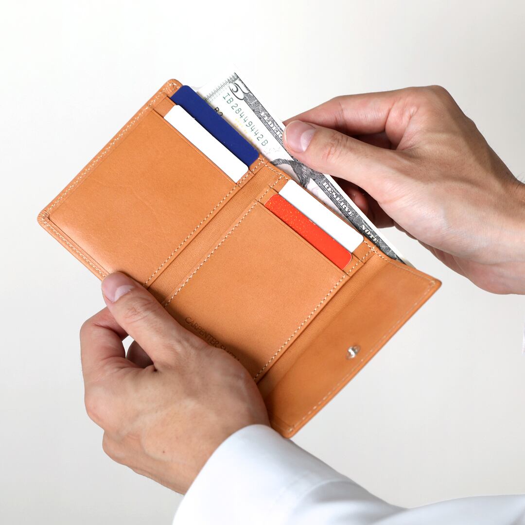 革工房『カーペンタースミス』さんが「小さくても普通に使いやすく」をコンセプトに、サイズやデザインを優先するあまりに仕様に制約が生じる一般的な小さい財布とは一線を画し、ユーザー目線で研究・設計した、Made in 清澄白河(国産)の小さい財布です