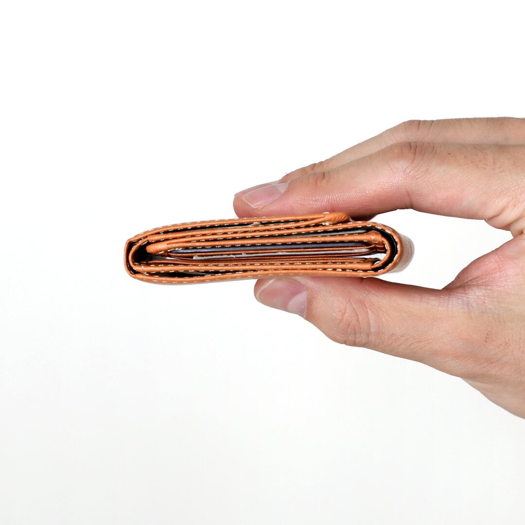 小さい財布の縫製こそ高い技術であるとともに、小さい財布の設計も職人の技術です。財布全体と各パーツごとに革の厚みをとことん研究、手のひらサイズの財布に仕上げました。